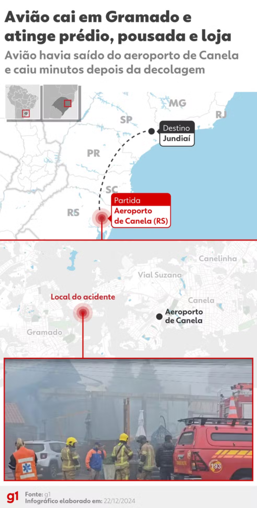 A aeronave que caiu na manhã deste domingo (22) em Gramado, no Rio Grande do Sul, atingiu uma loja de móveis, uma pousada e a chaminé de um prédio. Uma câmera de segurança mostrou o momento em que a aeronave atinge o entorno.